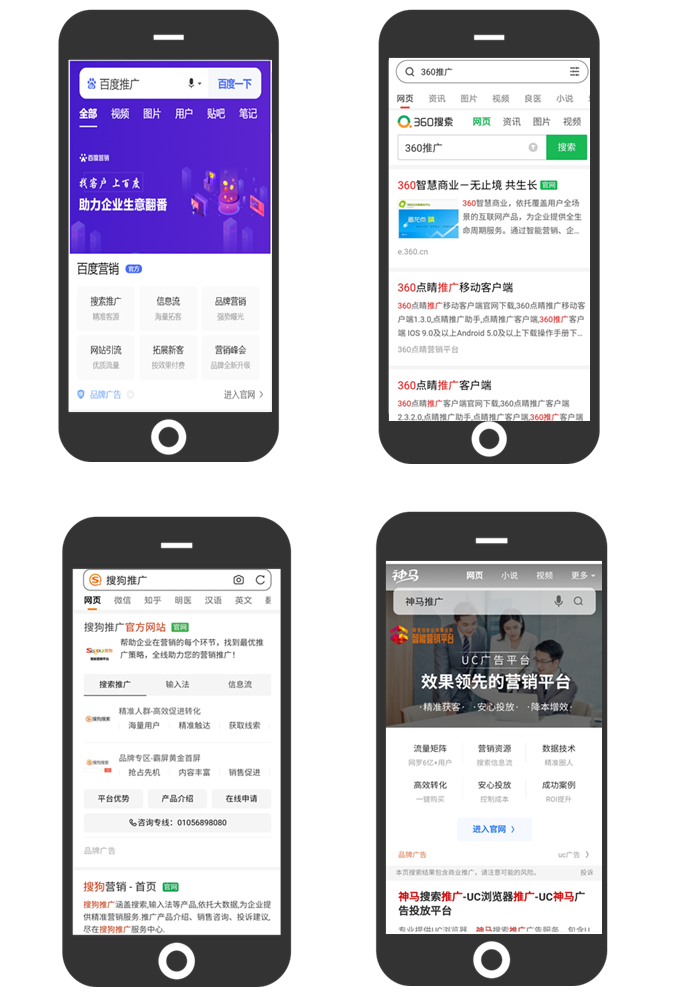四大搜索百度搜狗360神马精准投放 QQ 微信、今日头条 抖音快手等资源, 知乎 小红书 一点资讯 趣头条 东方头条等信息流广告定向投放;更有 搜狗手机输入法边打边搜。
